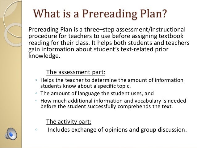 Prereading Plan (PreP)-Teachers start by telling students to "think of anything that comes to mind when..." Students can discuss their thoughts with other classmates. Then, the teacher asks "What made you think of [student response]." Students share and listen to their peer responses. Last, the teacher asks "Are there any new ideas about..." This allows students to think carefully and critically about the topic before reading. Teachers can also use this strategy to assess how much prior knowledge their students have before reading.